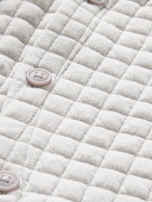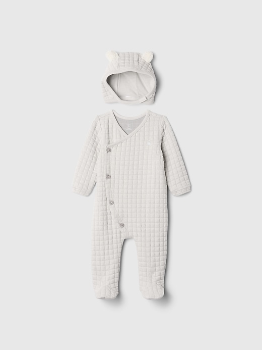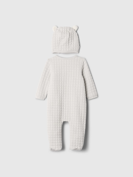 - Soft double knit quilted one-piece and hat set.