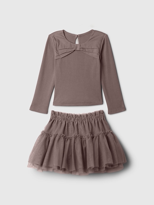 - Soft, stretch knit top and mesh skirt set.