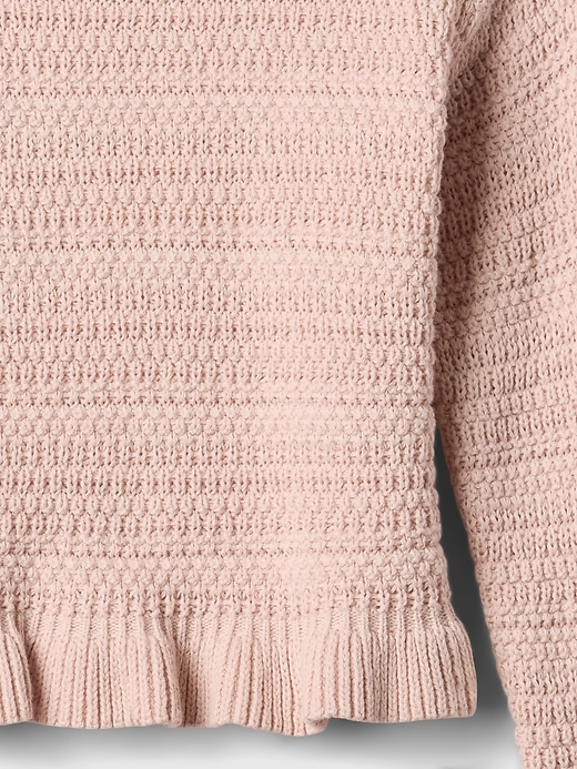 - Ruffle hem detail at sweater and skirt.