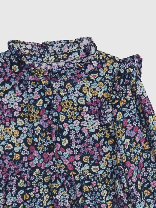 - Ruffled round neck, front button placket.
