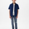 - Button at center (sizes 4-8 have a hook & bar closure beneath faux snap for easy on and off), zip fly.