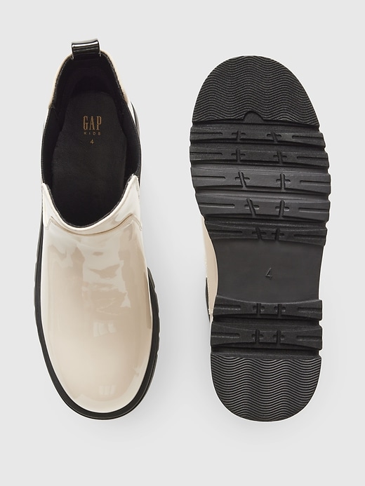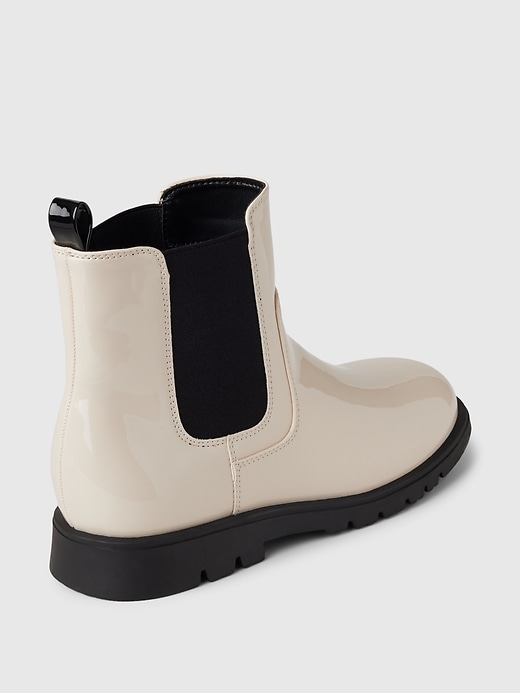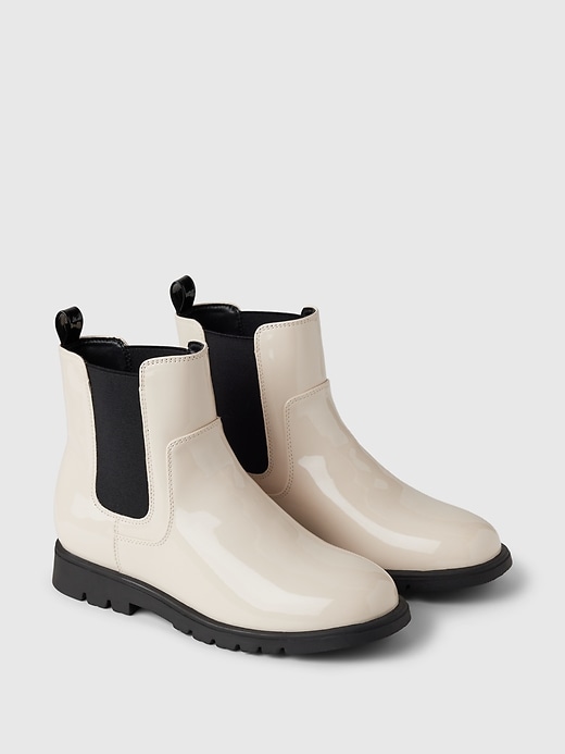 - These boots are made with a vegan patent leather upper.
