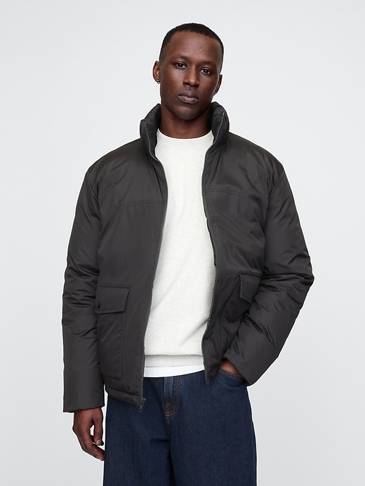 - This puffer jacket is made with 100% recycled polyester. Compared to virgin materials, using recycled materials helps to reduce resource use and waste.