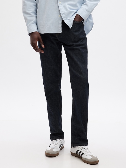 - Look: A classic five-pocket jean in a dark indigo wash.