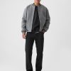 - Button closure, zip fly.