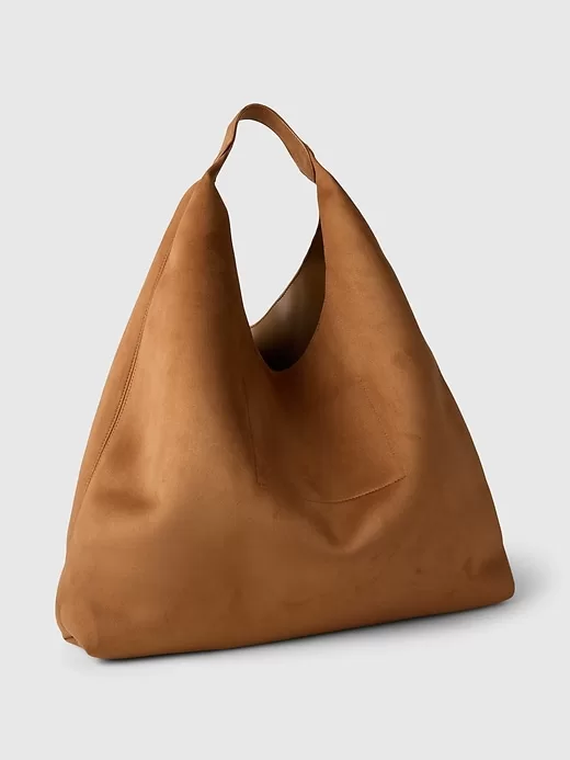- Soft vegan suede slouchy tote bag.
