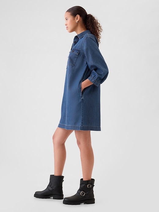 - Soft denim pullover mini shirtdress.