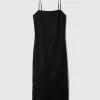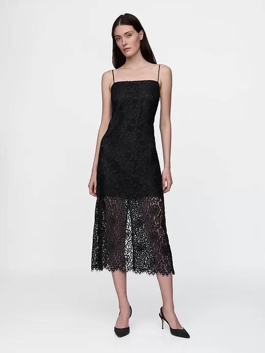 - Soft lace and smooth satin-lined midi dress.