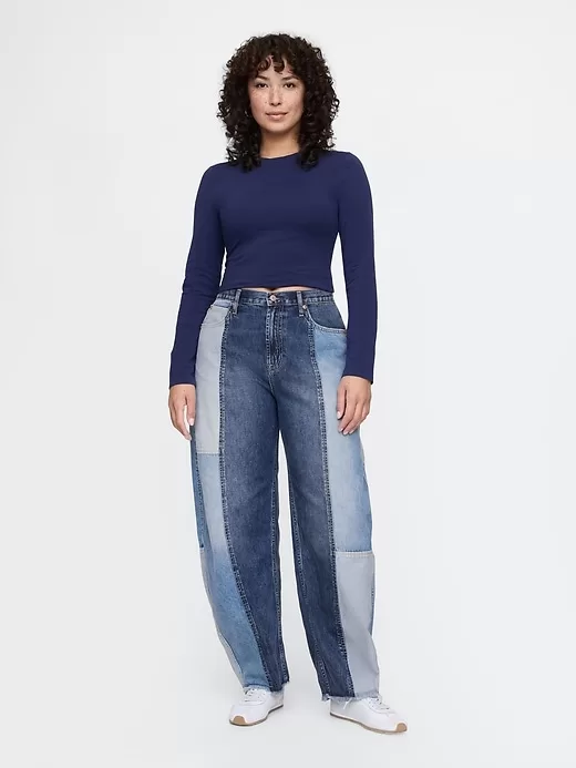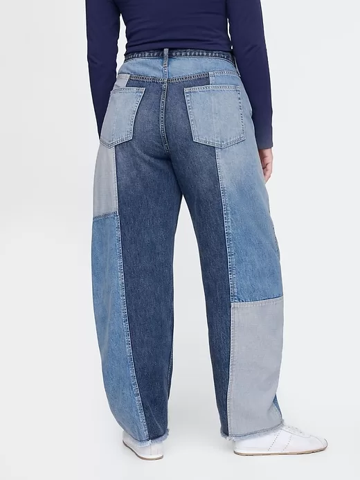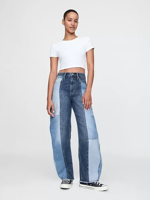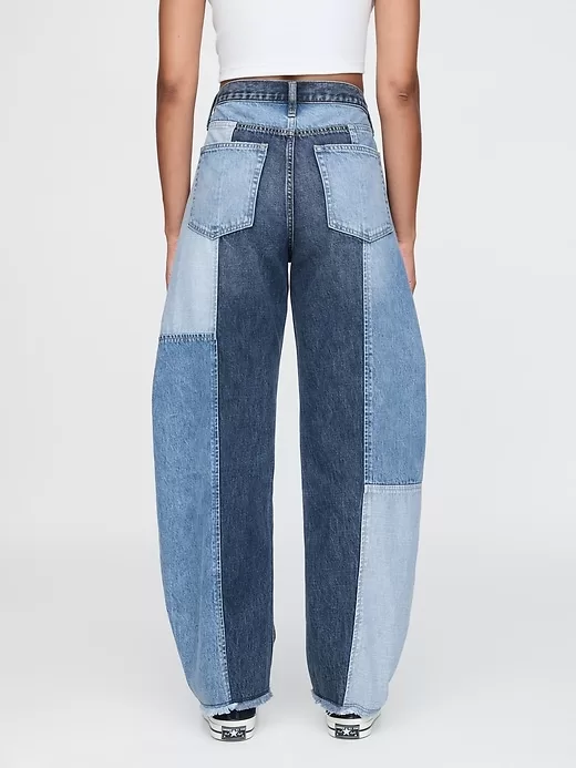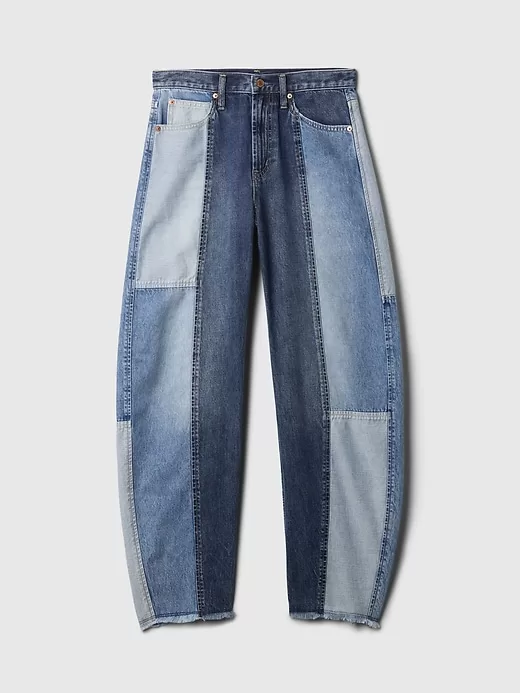 - Look: A classic five-pocket barrel jean in patchwork denim washes.
