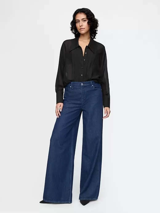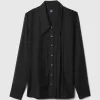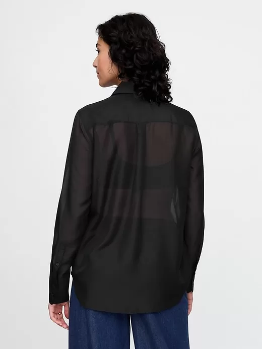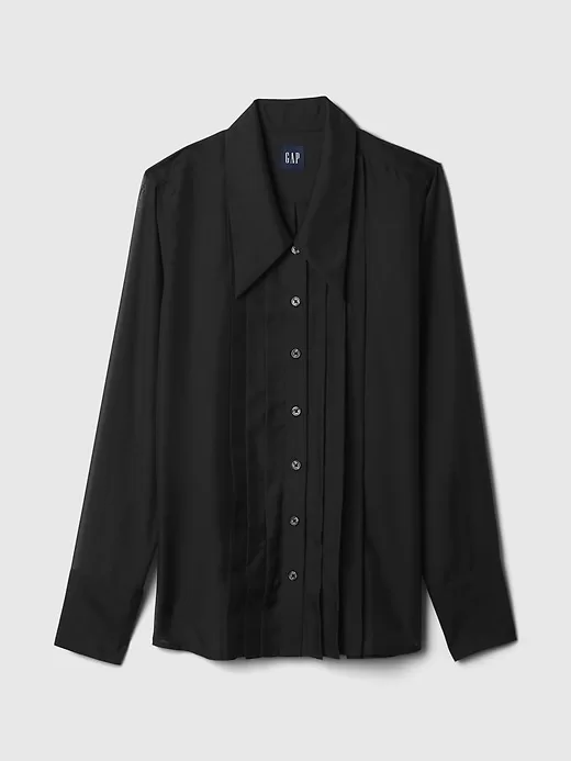 - Silky smooth, sheer button-up tuxedo shirt.