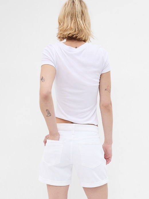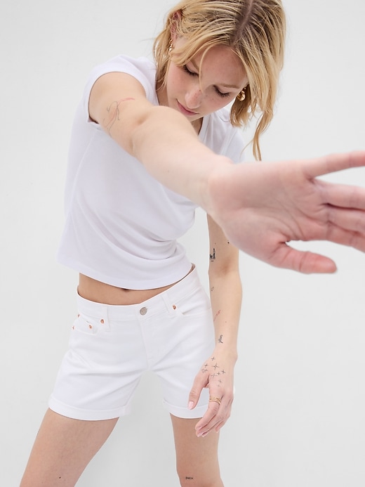 - Look: A classic five-pocket white denim short with a rolled hem.