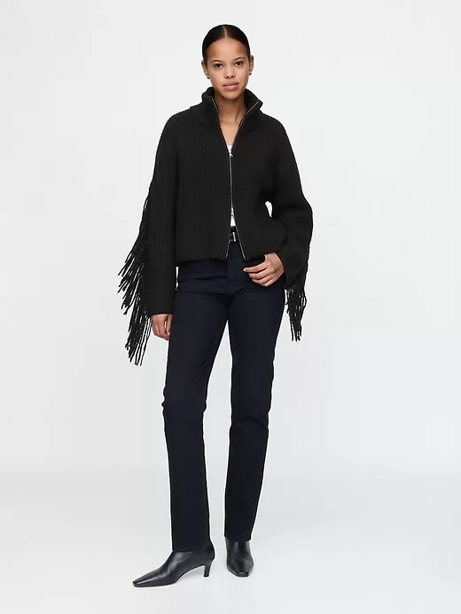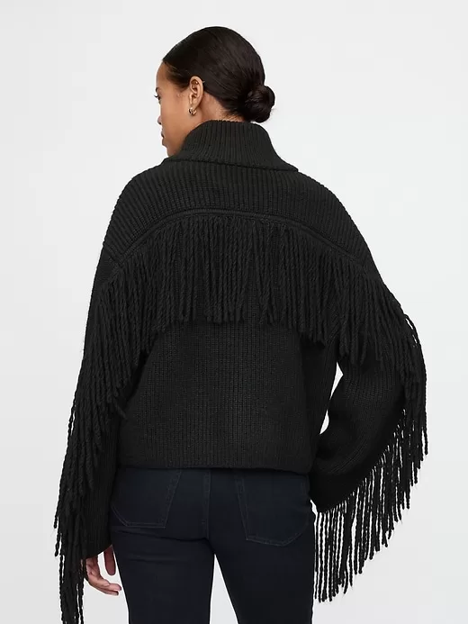 - Fringe detail at back seam and back sleeves.