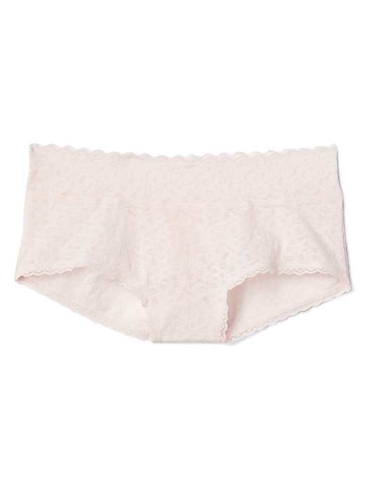 - Elasticized lace with scalloped detail trim at waistband at leg openings.
